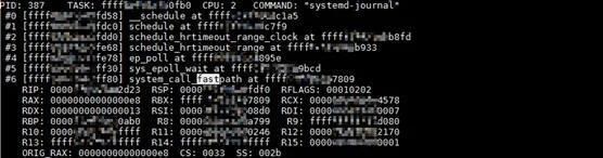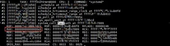 图7 这部分内容,有三个重点数据需要注意,panic 调用 __crash_kexec 函数的返回值,这个值是panic 函数的一条指令的地址;__stack_chk_fail 调用 panic 函数的返回值,同样的,它是__stack_chk_fail 函数的一条指令的地址;ffffxxxxxxxx87eb 这个指令地址,属于另外一个未知函数,这个函数调用了 __stack_chk_fail。 Syscall number 和 Syscall table 因为带有 system_call_fastpath 函数的调用栈,对应着一次系统调用,而 panic 的调用栈是坏的,所以这个时候我们自然而然会疑问,到底这个调用栈对应的是什么系统调用。 在 linux 操作系统实现中,系统调用被实现为异常。而操作系统通过这次异常,把系统调用相关的参数,通过寄存器传递到内核。在我们使用 bt 命令打印出调用栈的时候,我们同时会输出,发生在这个调用栈上的异常上下文,也就是保存下来的,异常发生的时候,寄存器的值。 对于系统调用(异常),关键的寄存器是 RAX,如图 8 所示。它保存的是系统调用号。我们先找一个正常的调用栈验证一下这个结论。0xe8 是十进制的 232。