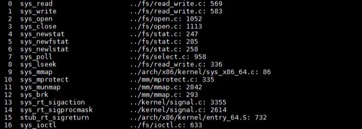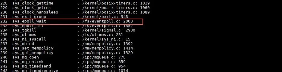 图8 使用 crash 工具,sys -c 命令可以查看内核系统调用表。我们可以看到,232 对应的系统调用号,就是 epoll,如图 9 所示。