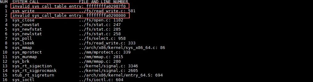 图10 从图 11 中,我们可以看出,有问题的系统调用表显然是被修改过的。修改系统调用表(system call table)这种事情,常见的有两种代码会做,这个相当辩证。一种是杀毒软件,而另外一种是病毒或木马程序。当然还有另外一种情况,就是某个蹩脚的内核驱动,无意识地改写了系统调用表。 另外我们可以看到,被改写过的函数的地址,显然和最初被 __stack_chk_fail 函数报出来的地址,是非常邻近的。这也可以证明,系统调用确实是走进了错误的 read 函数,最终踩到了__stack_chk_fail 函数。