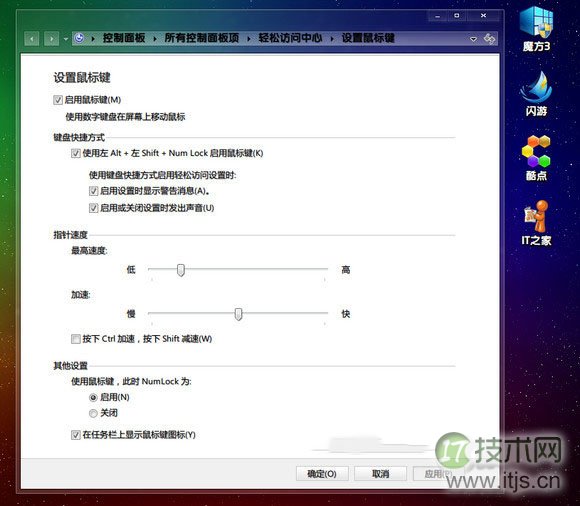 各位Windows 7用户,系小技都碰到过这尴尬的统中事情吧,比如有时因为忘记带鼠标或者是利用触摸板临时故障,怎么办?数字鼠标 其实Windows 7系统下面,不必尴尬,香港云服务器键盘可以利用一下键盘来取代鼠标作用。代替只要同时按下【ALT】+键盘左【SHIFT】+【NumLock】,系小技便可快速启用。统中