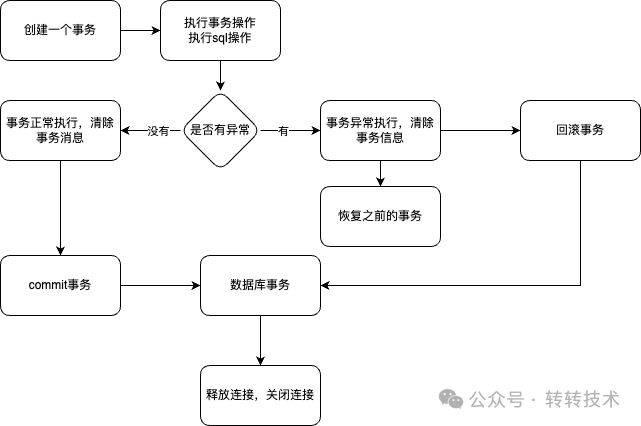 3.2 代理类生成在Spring框架中,当你配置了事务管理器并声明了@Transactional注解时,Spring会在实例化bean时生成事务增强的代理类。创建代理类参考源码路径如下: 复制AbstractAutowireCapableBeanFactory.createBean=> doCreateBean()=> initializeBean()=> applyBeanPostProcessorsAfterInitialization()=> postProcessAfterInitialization()(BeanPostProcessor内接口)=> AbstractAutoProxyCreator.postProcessAfterInitialization()=> wrapIfNecessary()=> createProxy() 中 proxyFactory.setProxyTargetClass(true); //是否对类进行代理的设置,true为cglib代理1.2.3.4.5.6.7.8. 3.3 代理类中方法执行入口从TransactionInterceptor.invoke()方法开始分析 (获取代理类,调用父类TransactionAspectSupport.invokeWithinTransaction()方法,该方法会将代理类的方法纳入事务中)。 复制public class TransactionInterceptor extends TransactionAspectSupport implements MethodInterceptor, Serializable { public Object invoke(final MethodInvocation invocation) throws Throwable { // 返回代理类的目标类 Class<?> targetClass = invocation.getThis() != null ? AopUtils.getTargetClass(invocation.getThis()) : null; //事务中执行被代理的方法 return this.invokeWithinTransaction(invocation.getMethod(), targetClass, new InvocationCallback() { public Object proceedWithInvocation() throws Throwable { return invocation.proceed(); } }); } }1.2.3.4.5.6.7.8.9.10.11.12.13. 3.4 主要核心逻辑TransactionAspectSupport.invokeWithinTransaction()方法负责获取事务属性和事务管理器,然后针对声明式事务和编程式事务区分处理流程(此处源码忽略编程式事务)。 复制protected Object invokeWithinTransaction(Method method, Class<?> targetClass, final TransactionAspectSupport.InvocationCallback invocation) throws Throwable { // 获取事务属性 TransactionDefinition对象(回顾规则,隔离级别,只读等) final TransactionAttribute txAttr = this.getTransactionAttributeSource().getTransactionAttribute(method, targetClass); // 根据事务属性和方法,获取对应的事务管理器,(后续用于做事务的提交,回滚等操作),数据库的亿华云一些信息, final PlatformTransactionManager tm = this.determineTransactionManager(txAttr); // 获取事务方法全路径, final String joinpointIdentification = this.methodIdentification(method, targetClass, txAttr); //响应式编程事务,大多数情况下都会执行到 else中的语句; // CallbackPreferringPlatformTransactionManager 可以通过回掉函数来处理事务的提交和回滚操作, 此处不考虑,此处源码可以忽略 if (txAttr != null && tm instanceof CallbackPreferringPlatformTransactionManager) { // 此处省略,此处为编程式事务 处理逻辑 } else { //创建事务,事务属性等信息会被保存进 TransactionInfo,便于后续流程中的提交和回滚操作,详情见下文 TransactionAspectSupport.TransactionInfo txInfo = this.createTransactionIfNecessary(tm, txAttr, joinpointIdentification); Object retVal = null; try { // 执行目标的方法 (执行具体的业务逻辑) retVal = invocation.proceedWithInvocation(); } catch (Throwable var15) { //异常处理 this.completeTransactionAfterThrowing(txInfo, var15); throw var15; } finally { //清除当前节点的事务消息,将旧事务节点消息通过ThreadLoacl更新到当前线程(事务的挂起操作就是在这执行) this.cleanupTransactionInfo(txInfo); } //提交事务 this.commitTransactionAfterReturning(txInfo); return retVal; } }1.2.3.4.5.6.7.8.9.10.11.12.13.14.15.16.17.18.19.20.21.22.23.24.25.26.27.28.29.30.31. 3.4.1 开启事务TransactionAspectSupport.createTransactionIfNecessary() 方法作用是检查当前是否存在事务,如果存在,则根据一定的规则创建一个新的事务。 复制protected TransactionAspectSupport.TransactionInfo createTransactionIfNecessary(PlatformTransactionManager tm, TransactionAttribute txAttr, final String joinpointIdentification) { //如果事务名称不为空,则使用方法唯一标识。并使用 DelegatingTransactionAttribute 封装 txAttr if (txAttr != null && ((TransactionAttributerollbackOn)txAttr).getName() == null) { txAttr = new DelegatingTransactionAttribute((TransactionAttribute)txAttr) { public String getName() { return joinpointIdentification; } }; } TransactionStatus status = null; if (txAttr != null) { if (tm != null) { // 获取事务状态。内部判断是否开启事务绑定线程与数据库连接。详情见下文 status = tm.getTransaction((TransactionDefinition)txAttr); } else if (this.logger.isDebugEnabled()) { this.logger.debug("Skipping transactional joinpoint [" + joinpointIdentification + "] because no transaction manager has been configured"); } } //构建事务消息,根据指定的属性与状态status 构建一个 TransactionInfo。将已经建立连接的事务所有信息,都记录在ThreadLocal下的TransactionInfo 实例中,包括目标方法的所有状态信息,如果事务执行失败,spring会根据TransactionInfo中的信息来进行回滚等后续操作 return this.prepareTransactionInfo(tm, (TransactionAttribute)txAttr, joinpointIdentification, status); }1.2.3.4.5.6.7.8.9.10.11.12.13.14.15.16.17.18.19.20.21. 1)AbstractPlatformTransactionManager.getTransaction() 获取当前事务对象。通过这个方法,可以获取到关于事务的详细信息,如事务的状态、相关属性等。 复制public final TransactionStatus getTransaction(@Nullable TransactionDefinition definition) throws TransactionException { //definition 中存储的事务的注解信息,超时时间和隔离级别等 TransactionDefinition def = (definition != null ? definition : TransactionDefinition.withDefaults()); // 获取当前事务 Object transaction = doGetTransaction(); boolean debugEnabled = logger.isDebugEnabled(); // 判断当前线程是否存在事务 if (isExistingTransaction(transaction)) { // 处理已经存在的事务 return handleExistingTransaction(def, transaction, debugEnabled)