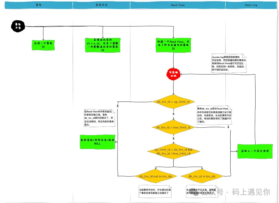 前文提到,每条记录都包含一个隐式字段db_trx_id,记录对该记录进行最新修改的事务ID,例如db_trx_id = 3; 接下来,数据库将检查此记录的db_trx_id与Read View进行可见性比较。 若db_trx_id < up_limit_id,则意味着在Read View中所有未提交事务创建之前,事务ID为3的操作已经提交,并在此期间没有新的提交。因此,对当前事务而言,此记录应该是可见的。若db_trx_id > low_limit_id,则表示事务ID为3的操作是在Read View中所有未提交事务创建之后才提交的,也就是在当前事务开启之后,有其他事务修改了数据并提交。因此,这条记录对当前事务来说是不可见的。(不可见时的处理将在后文讨论)另一种情况是,up_limit_id < db_trx_id < low_limit_id。在此情况下,将db_trx_id与Read View中的trx_ids逐一比较。 若db_trx_id在trx_ids列表中,表示在当前事务开启时,某些未提交事务对数据进行了更改并提交,因此,对当前事务来说,此记录应该是不可见的。若db_trx_id不在trx_ids列表中,表示在当前事务开启之前,其他事务对数据进行了修改并提交,所以对当前事务来说,该记录是可见的。因此,在读取记录时,经过上述判断,若记录对当前事务可见,则直接返回。若不可见,则需要利用undo log。 当数据的事务ID与Read View规则不符时,需要从undo log中获取数据的历史快照,然后使用数据快照的事务ID与Read View进行可见性比较。如果找到一条快照,则返回数据;否则,返回空。  图片